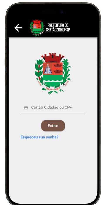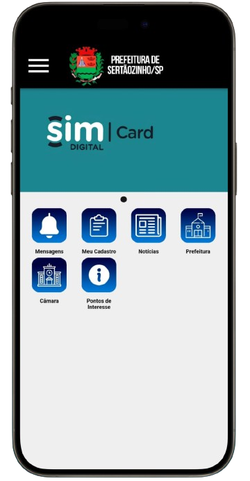 1 – Ao acessar o aplicativo “Sertãozinho Digital", será exibido uma mensagem de introdução, explicando sobre o projeto Cartão Cidadão, etapas para cadastramento no aplicativo e canais de comunicação;
